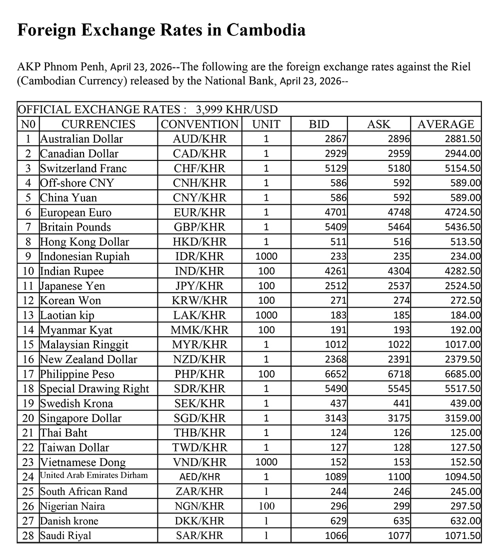 AKP Phnom Penh, April 23, 2026--The following are the foreign exchange rates against the Riel (Cambodian Currency) released by the National Bank, April 23, 2026--