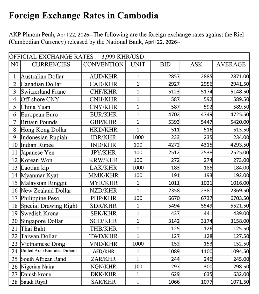 AKP Phnom Penh, April 22, 2026--The following are the foreign exchange rates against the Riel (Cambodian Currency) released by the National Bank, April 22, 2026--