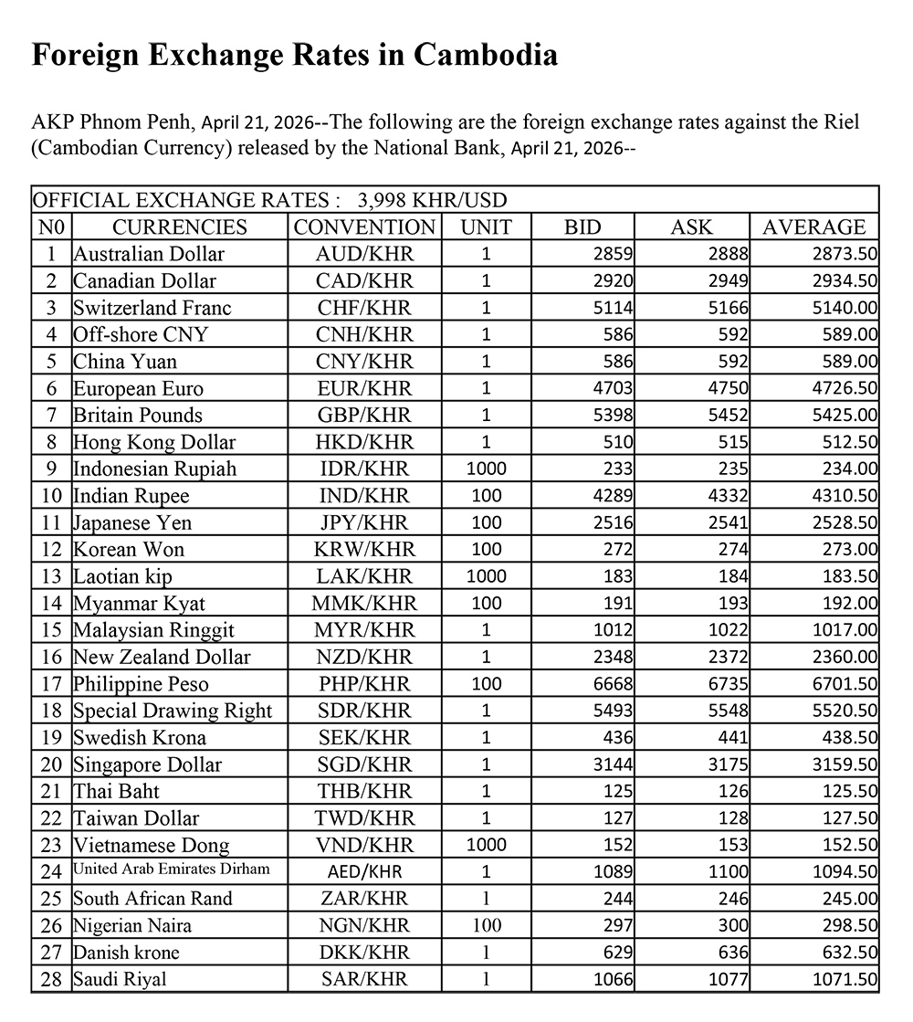 AKP Phnom Penh, April 21, 2026--The following are the foreign exchange rates against the Riel (Cambodian Currency) released by the National Bank, April 21, 2026--